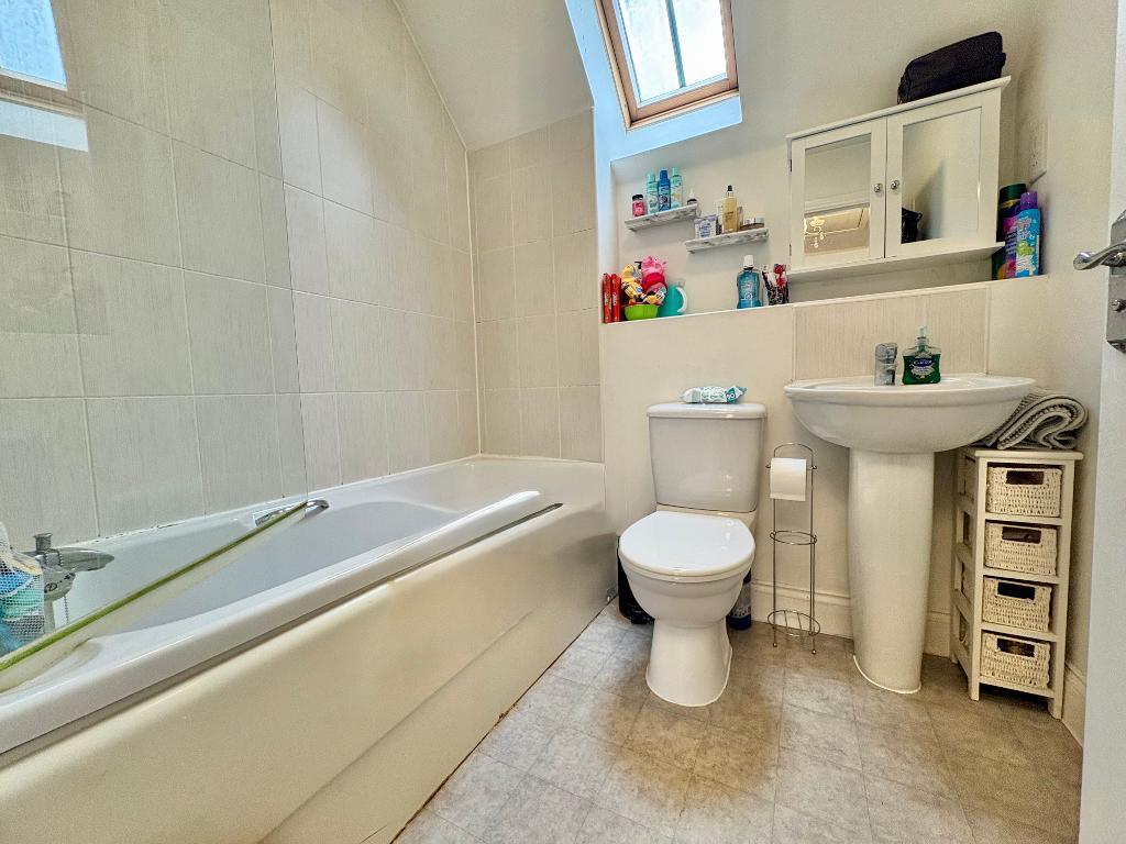 Upstairs, the spacious landing leads to two generous bedrooms. The main bedroom enjoys fitted wardrobes with sliding doors, a front-facing window, and an airing cupboard positioned over the stairs. The second bedroom offers a peaceful outlook over the rear garden. A well-appointed family bathroom includes a panelled bath with overhead shower, a wash basin, and WC, complemented by a skylight that allows in natural light.