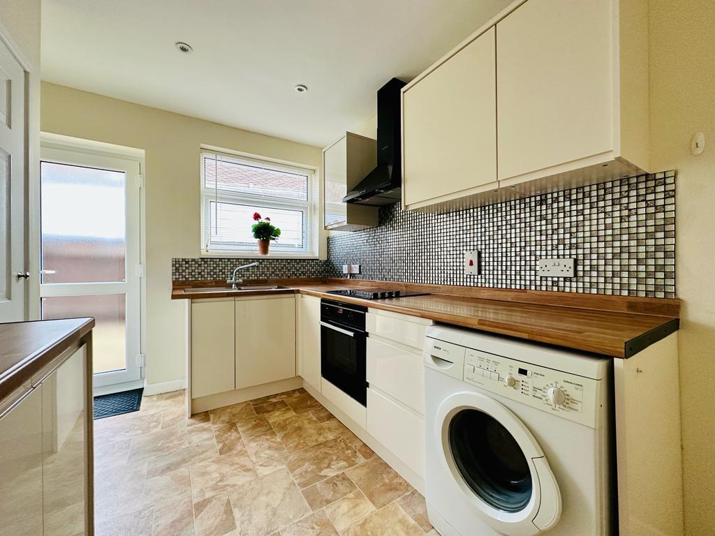 The kitchen has a range of wall & base level units, inset sink unit, tiled splashbacks, built in oven & hob, space for fridge/freezer, plumbing for washing machine, built in cupboard and has vinyl flooring.