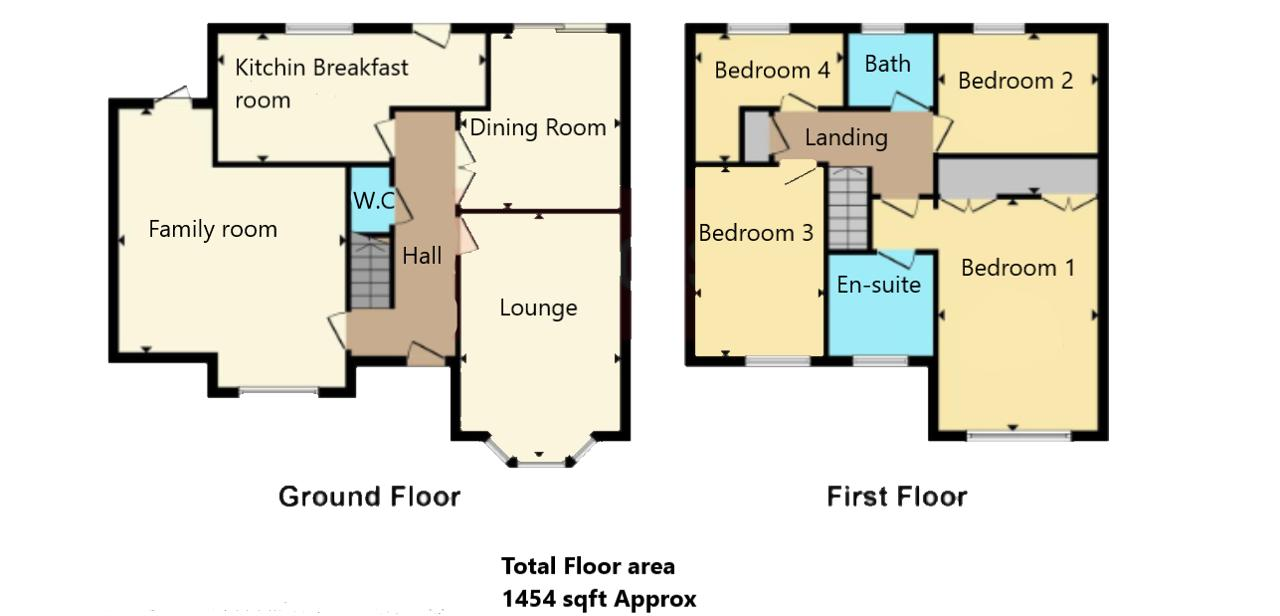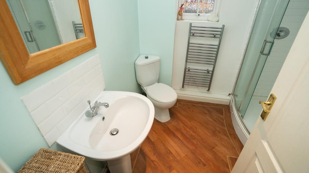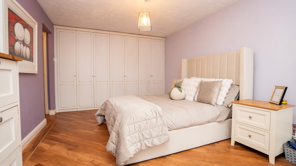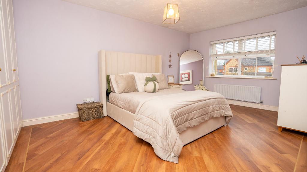 To the first floor, there are four well-proportioned bedrooms, including a spacious principal bedroom with fitted wardrobes and a contemporary en-suite shower room. A stylish family bathroom serves the remaining bedrooms.