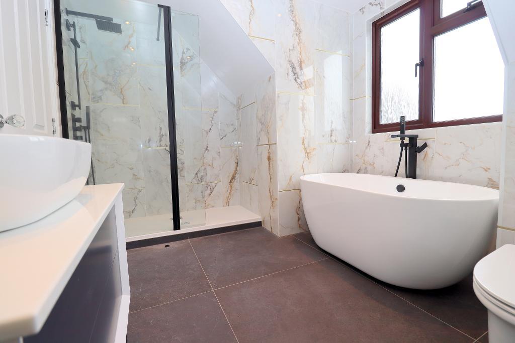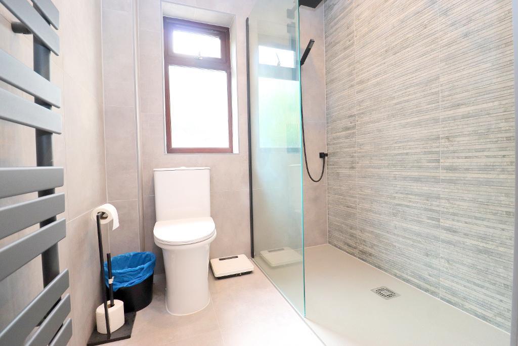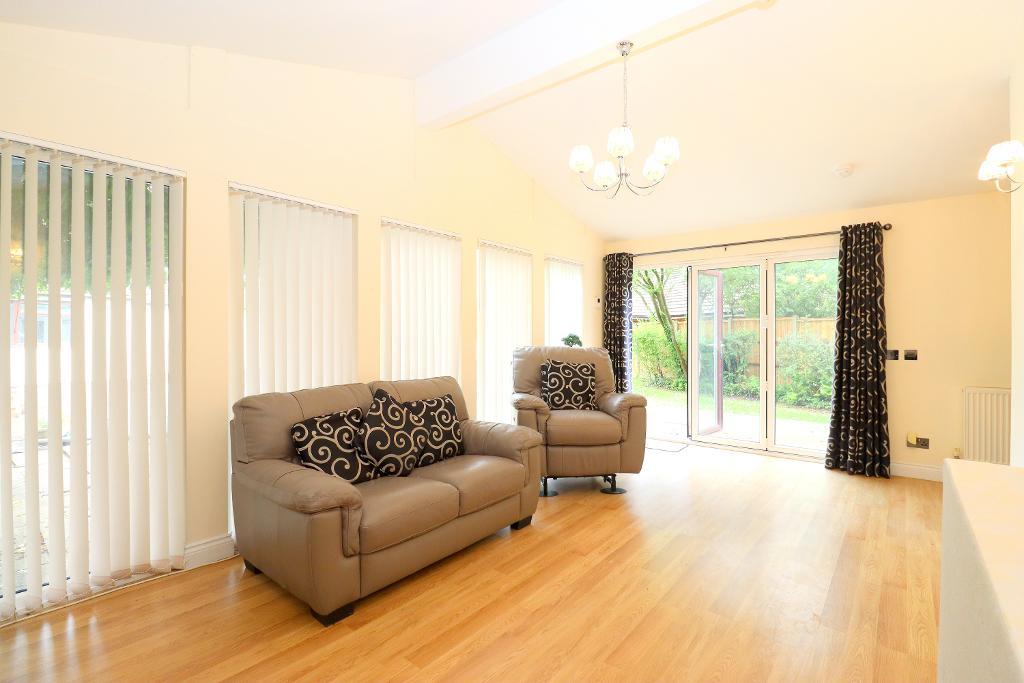 Internally the property briefly comprises a large inviting entrance hall, study with built in storage, 23 ft. lounge with modern feature fire place, spot lights to ceiling and opening through to the dining room with doors to the rear garden. The stunning refitted kitchen benefits from a range of wall and base units, inset sink unit, built in double oven, built in appliances, spot lights to ceiling, tiled flooring, space for American fridge/freezer and door to the rear garden. Bedroom two is located on the ground floor with built in wardrobes and a en-suite wet room comprising of a walk in shower, wash hand basin, WC and heated towel rail. There is also a further bedroom with views to the rear aspect and a family shower room comprising of a walk in shower cubicle, vanity wash hand basin and WC.