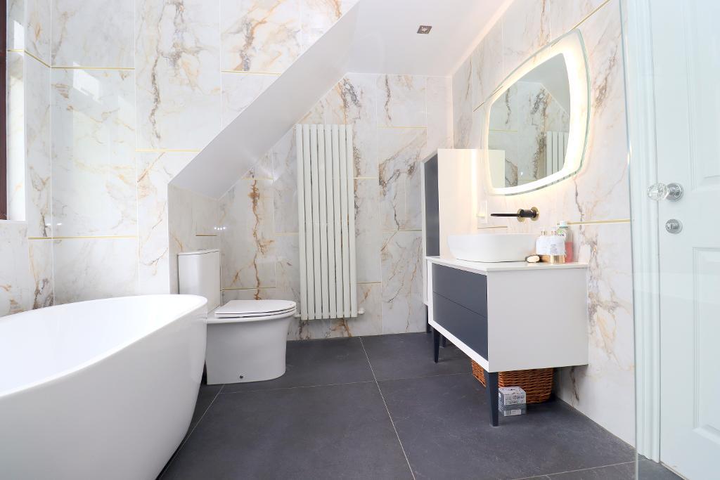 To the first floor there is a landing, three double bedrooms with the master benefiting from air conditioning, walk in wardrobe, and a lovely en-suite with his and hers sink units, large walk in shower, WC and spot lights to cieling. There is a walk in loft from the second bedroom and a beautiful refitted four piece family bathroom suite comprising of a free standing egg bath, large walk in shower cubicle, wash hand basin and modern verticle radiator.