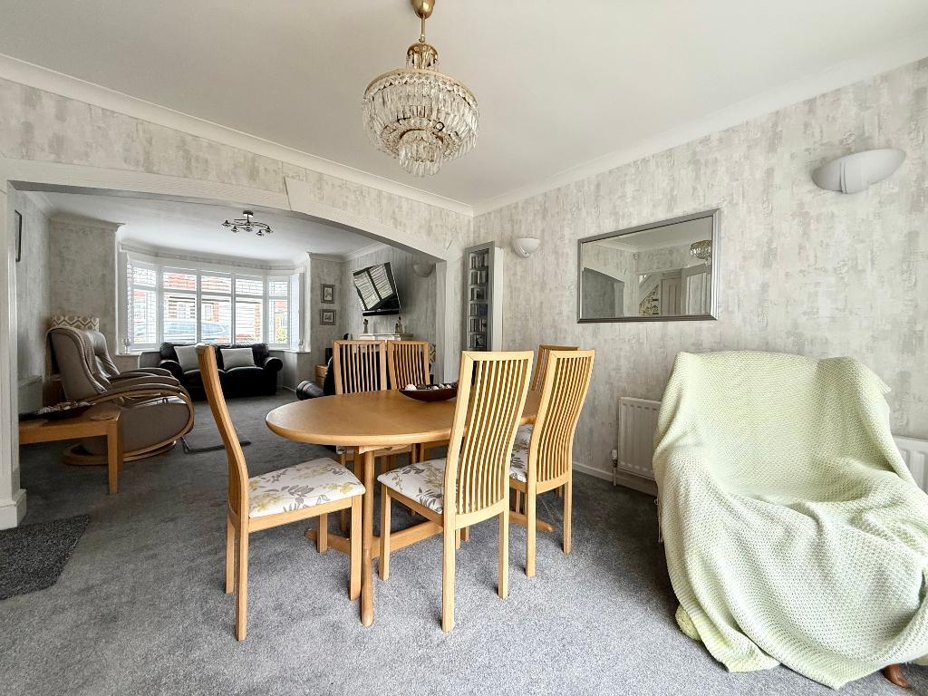 Internally the property briefly comprises an entrance porch, entrance hall, bay fronted living room with feature fire place, dining room with sliding patio doors opening to the rear garden. There is a lovely refitted handleless kitchen comprising a range of wall and base units, inset sink unit, built in appliances and door to the side.