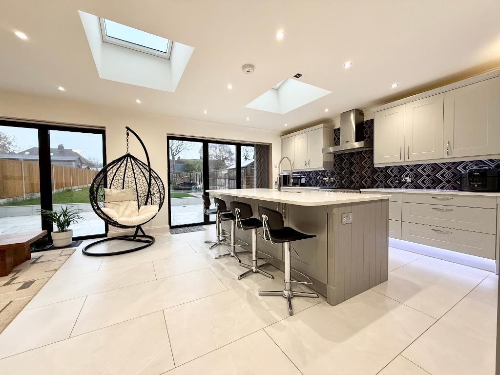 The heart of the home is the impressive open-plan kitchen/diner and sitting room. The contemporary kitchen features a large central island, built-in oven, dishwasher, and designated space for an American-style fridge/freezer. Ample storage solutions make the space practical as well as stylish. Bi-fold doors span the rear of the property, seamlessly connecting the living space to the garden and creating a wonderful indoor/outdoor flow. Downstairs offers underfloor heating and hickvision Colour vue CCTV and security monitoring system.