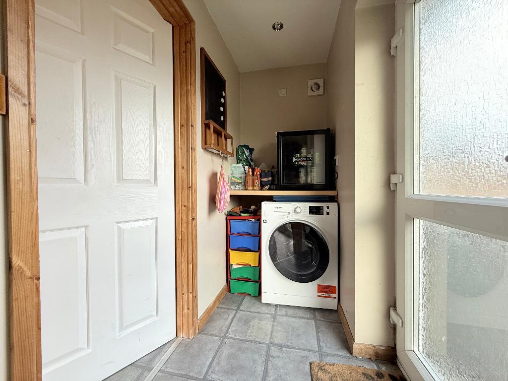 Internally the property briefly compries an entrance hall, cloakroom comprising a wash hand basin and WC, utility room with space for washing machine and lounge with feature fire place and French doors to the garden. The kitchen benefits from a range of wall and base units, inset sink unit amd space for all appliances.