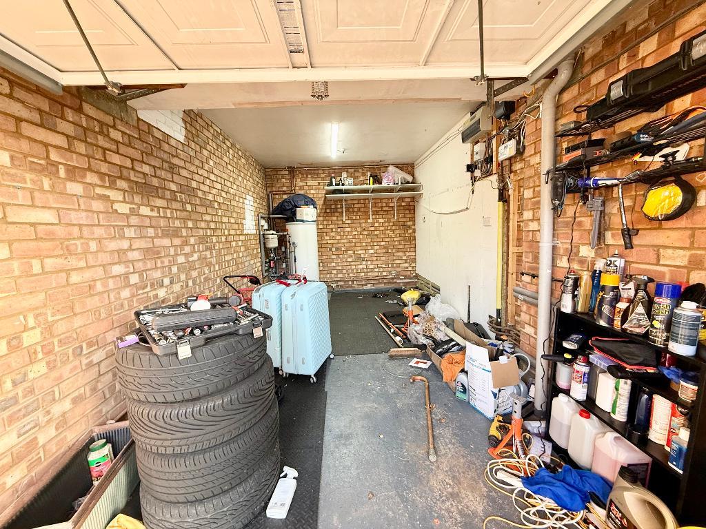 Externally, the property offers a block-paved driveway providing off-road parking for up to six vehicles, a front garden laid to lawn, and a large rear garden with lawn and patio areas, mature shrubs and trees, a shed with power and light, gated side access, and an additional gate to the front.