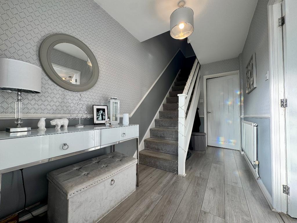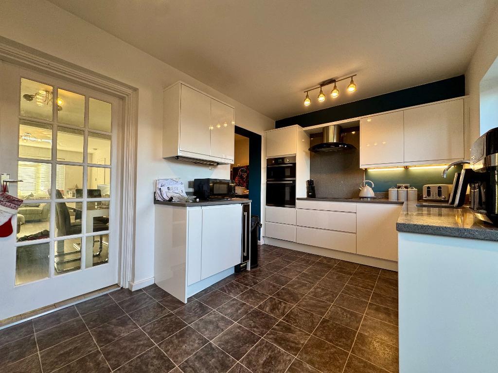 The accommodation briefly comprises an added entrance porch and welcoming hallway with stairs to the first floor, a spacious lounge, and an adjoining dining area. To the rear is a bespoke refitted kitchen/breakfast room featuring integrated appliances, elegant worktops and patio doors opening directly onto the rear garden. Additional ground-floor benefits include a utility room and a modern shower room.
