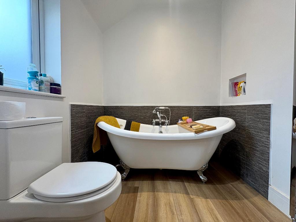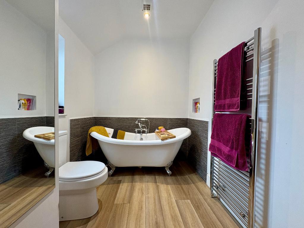 Upstairs are three generous double bedrooms. The principal suite benefits from a dedicated dressing area and a luxurious ensuite bathroom featuring a free-standing roll-top bath and separate rain shower, while bedroom two also enjoys an ensuite.