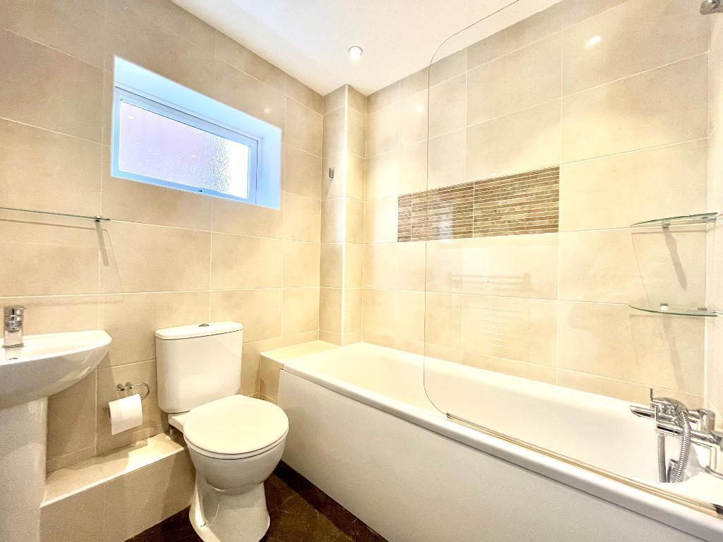 To the first floor, there is a landing, a well-proportioned double bedroom with built-in wardrobes, and a fully tiled bathroom comprising a bath with shower over, wash hand basin, WC, and ceiling spotlights.