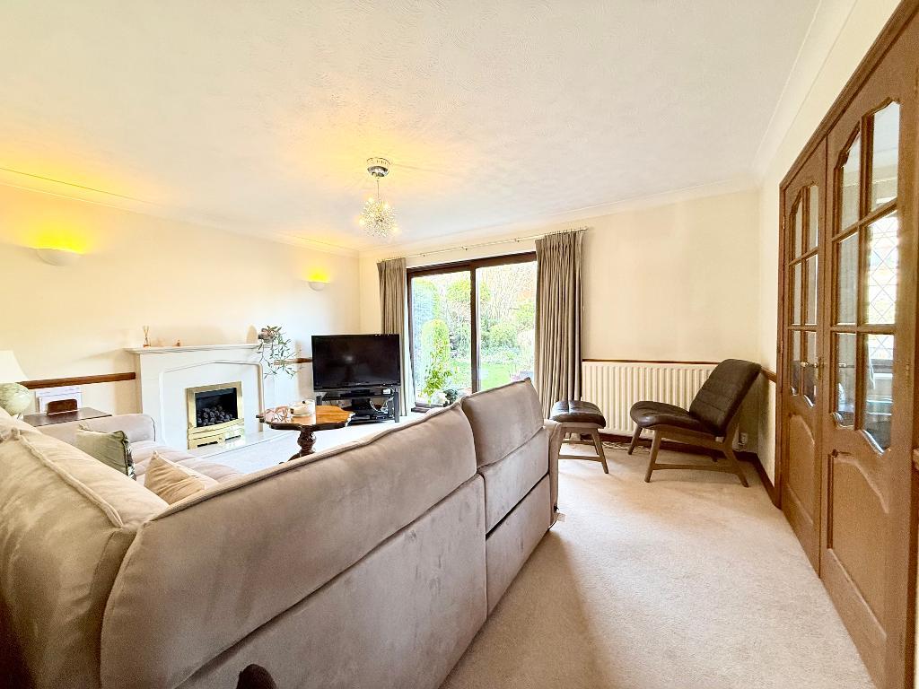 The living room is a bright and inviting space, benefitting from double glazed patio doors opening onto the rear garden, a feature fireplace and double doors leading through to a separate dining room — ideal for both everyday family living and entertaining.