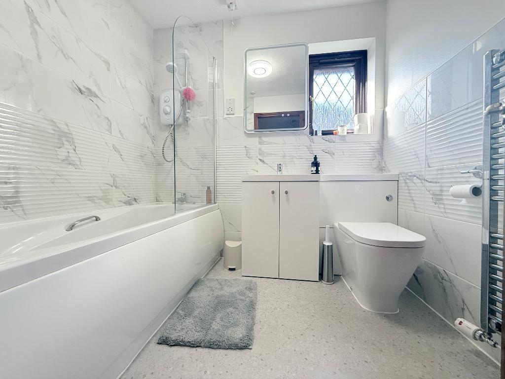 To the first floor are four excellent-sized bedrooms, all of which benefit from built-in wardrobes. The master bedroom enjoys the added advantage of an en-suite shower room. The family bathroom has also been refitted and comprises a bath with overhead shower, wash hand basin set within a vanity unit, low level WC and part-tiled walls.