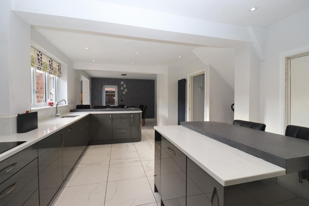 Internally the property briefly comprises of an entrance hall, cloakroom, lounge and a stunning refitted grey gloss kitchen comprising of floor to ceiling units, a range of base units, breakfast bar, central island, built in eye level double oven, built in appliances, modern vertical radiator, spot lights to ceiling, tiled flooring and French doors opening to the rear garden. There is also a dining area/snug at the rear leading off the kitchen.