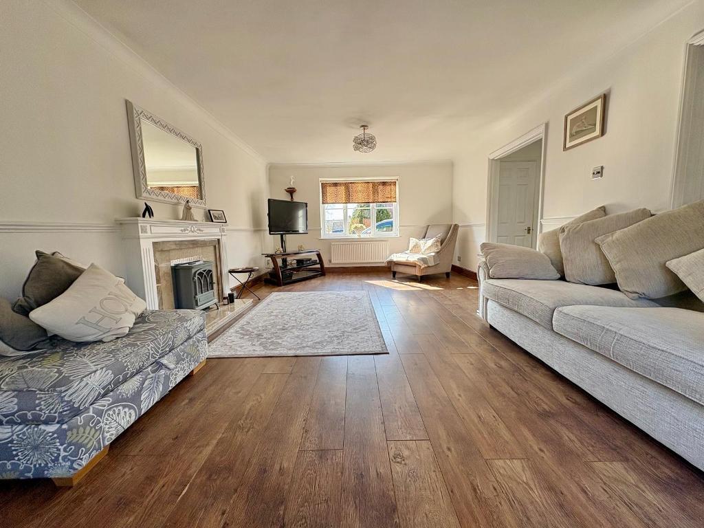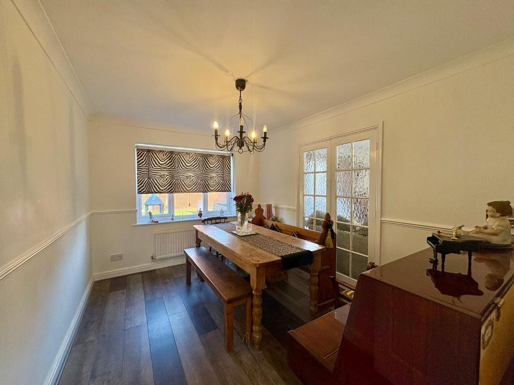 A welcoming entrance hall provides access to the home, with stairs rising to the first floor and a convenient cloakroom fitted with a low-level WC and wash hand basin and shower . The lounge is a spacious and light-filled reception room, featuring a gas fireplace, a double-glazed window to the front, and double doors opening onto the rear garden, creating an excellent space for both relaxing and entertaining. The dining room enjoys views over the garden and offers an ideal setting for formal dining.