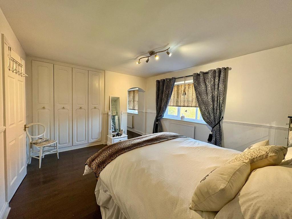 Upstairs, the landing provides access to all rooms, along with an airing cupboard housing the hot water tank and access to a boarded loft via ladder. The principal bedroom is well-proportioned and features fitted wardrobes, leading through to a dressing area and ensuite shower room. There are three further double bedrooms, all well-sized and served by a family bathroom fitted with a panelled bath with shower attachment, low-level WC, wash hand basin, and heated towel rail.