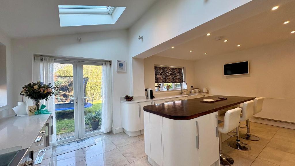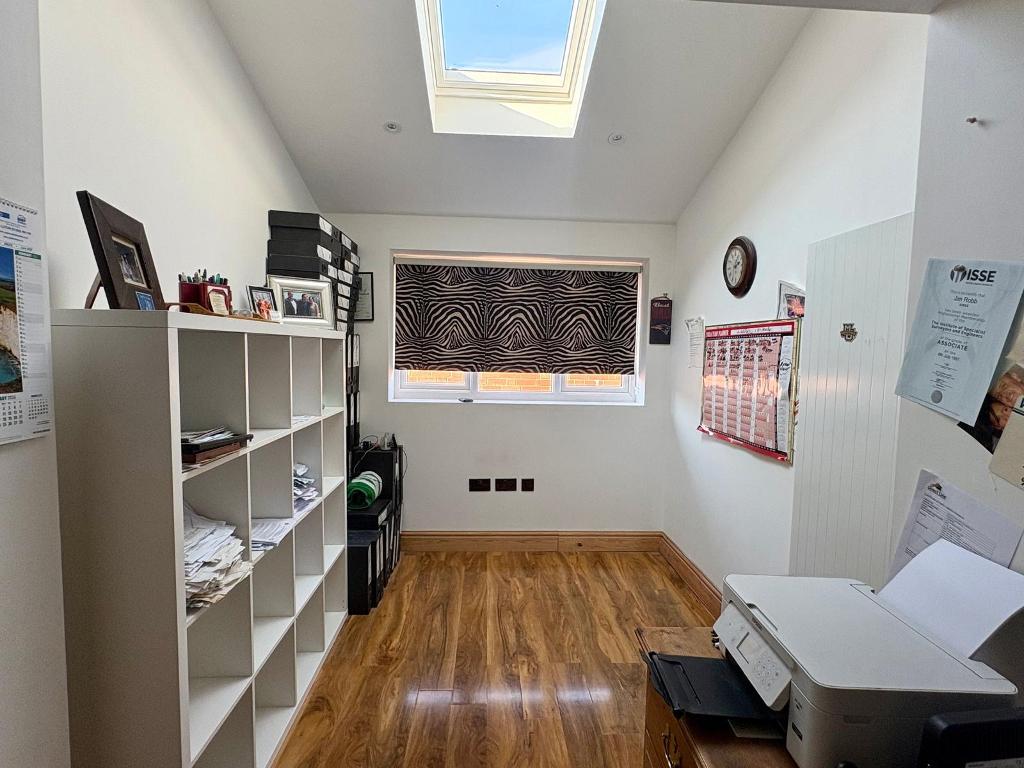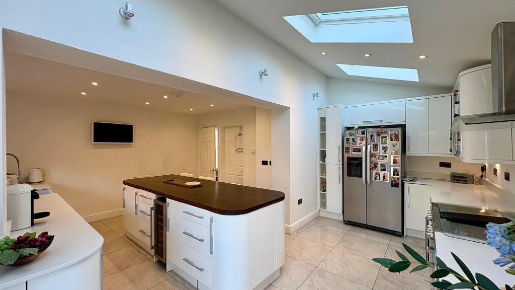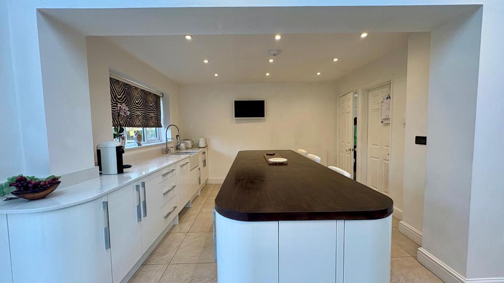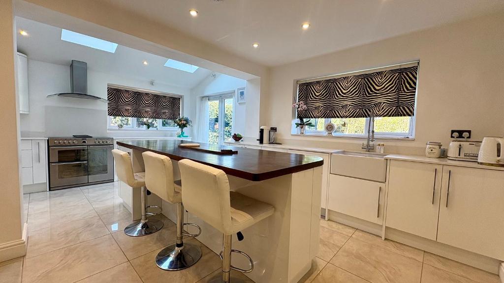 The ground floor also benefits from a versatile fifth bedroom, which could equally serve as a home office or provide ideal accommodation for an elderly relative. At the heart of the home is an impressive open-plan kitchen and breakfast room, fitted with a comprehensive range of base and wall units, complemented by marble work surfaces and a central island. There is a 1.5 bowl stainless steel sink with mixer tap, space for a Rangemaster-style oven and an American-style fridge freezer, as well as an integrated dishwasher. The space is enhanced by underfloor heating, a rear aspect window, two skylights flooding the room with natural light, and double doors opening onto the garden, along with an additional door providing side access. A separate utility room offers further storage, work surfaces, a stainless steel sink, and space and plumbing for a washing machine and tumble dryer.