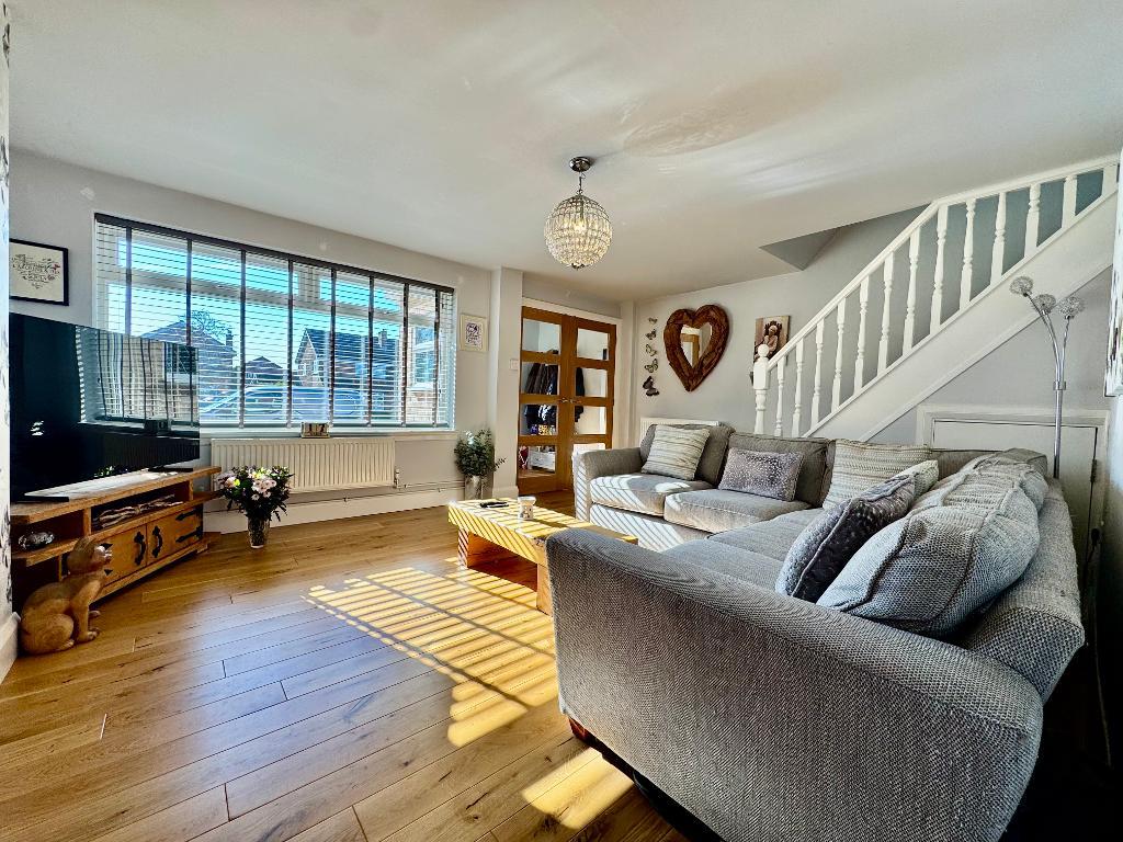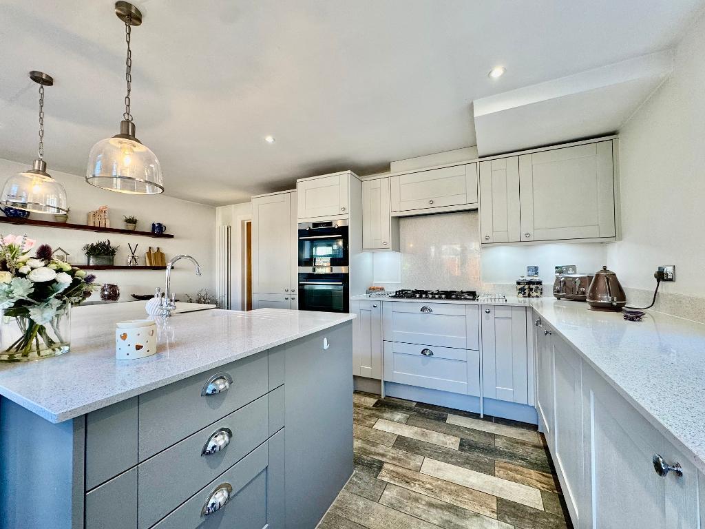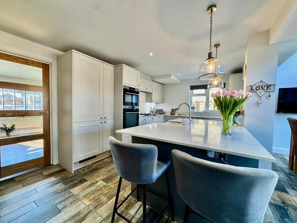 The generous living room is beautifully presented, also benefitting from oak flooring, fitted blinds and carpeted stairs rising to the first floor, creating a warm and inviting environment. To the rear, the property has been significantly extended and thoughtfully modernised, resulting in an impressive open-plan kitchen and living area. The re-fitted kitchen is finished to a high standard and features a central island with breakfast bar, a butler sink, integrated appliances including fitted white goods and a wine cooler, along with ample storage.