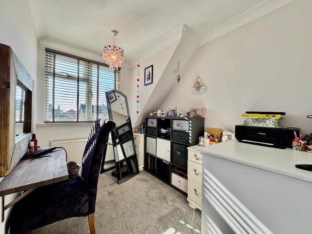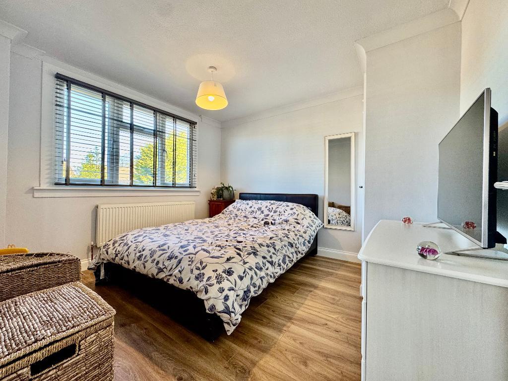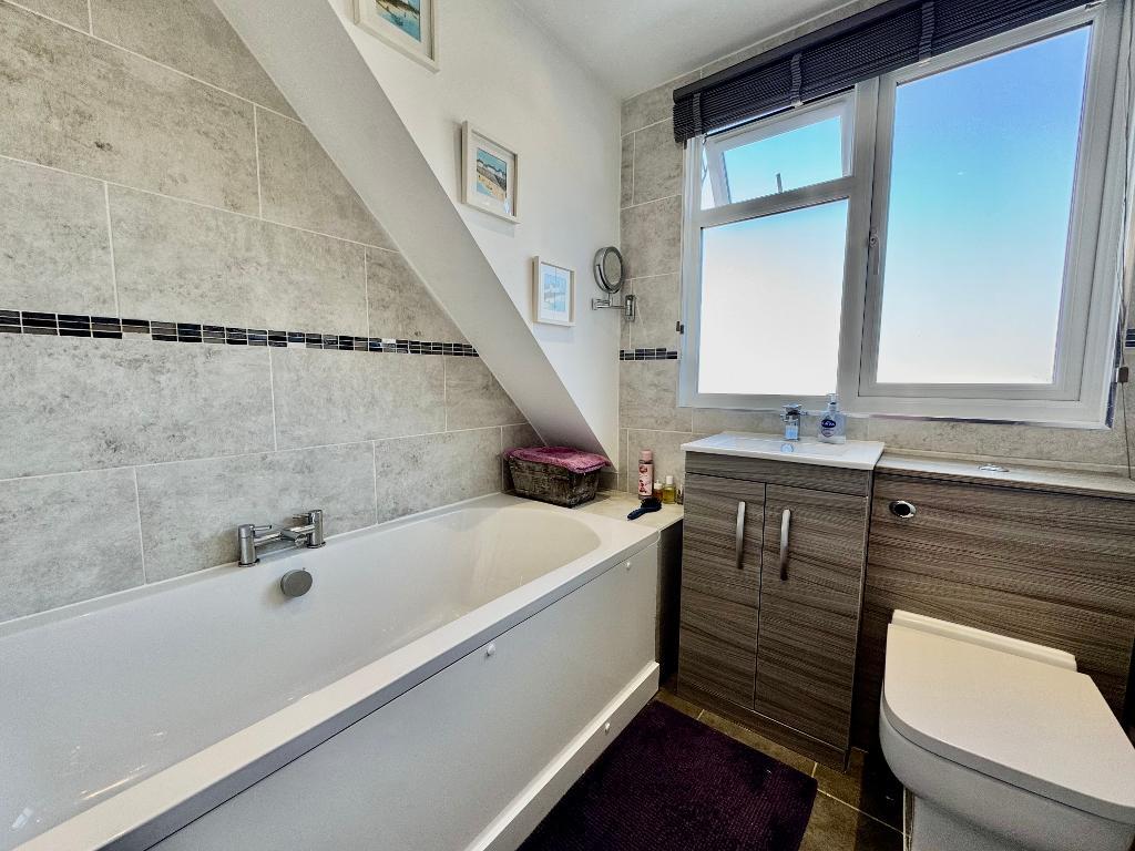 To the first floor, there are two spacious double bedrooms, both benefitting from fitted wardrobes, laminate flooring and double-glazed windows. A third single bedroom also includes fitted wardrobe space, making it ideal as a child"s room, study or home office. The family bathroom has been re-fitted to a modern standard, fully tiled and fitted with a white suite including a shower over the bath.
