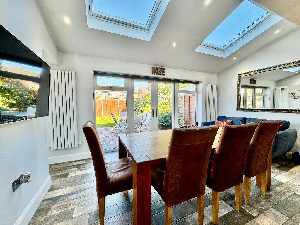 The adjoining sitting and dining area is enhanced by tiled flooring, two Velux windows set within a pitched roof, and double-glazed French doors opening onto the rear garden, allowing an abundance of natural light to fill the space. A ground floor cloakroom with WC and an additional shower further enhances the practicality of the home.