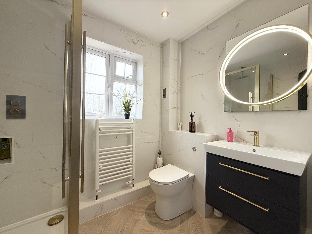 Upstairs, the property continues to impress with four generously sized bedrooms. Bedrooms three and four benefit from built-in wardrobes, while the luxurious principal bedroom boasts a contemporary en-suite with a walk-in shower, vanity wash basin, and WC. A beautifully appointed family shower room, featuring a large walk-in shower and modern fittings, serves the remaining bedrooms.