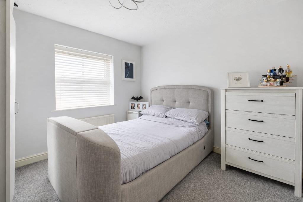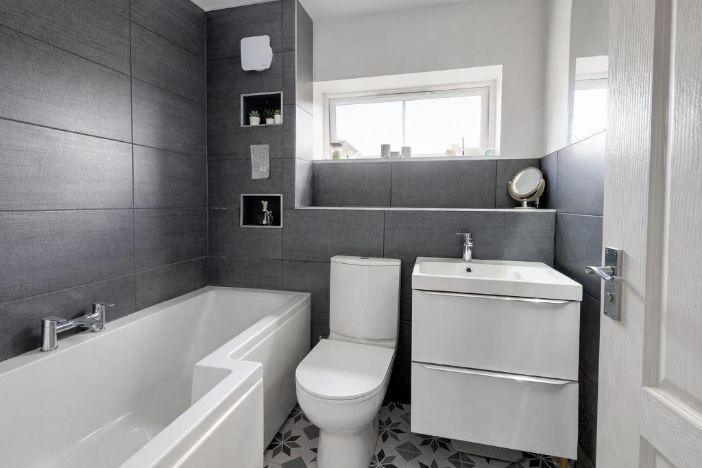 To the first floor, three well-appointed bedrooms provide comfortable and versatile accommodation, with the principal bedroom benefiting from a private en-suite. A contemporary re-fitted family bathroom serves the remaining bedrooms.