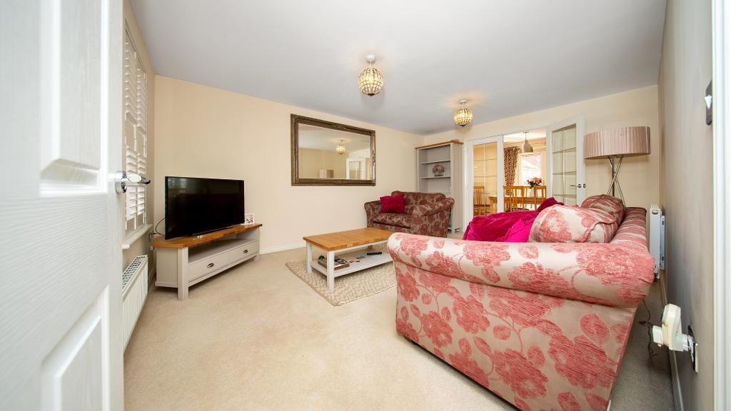 Internally, the home is beautifully presented and thoughtfully arranged. A welcoming entrance hall leads to a convenient ground floor cloakroom with WC, wash hand basin, and shower. The spacious lounge is flooded with natural light, featuring double doors opening into the dining room, creating an ideal space for both relaxing and entertaining.