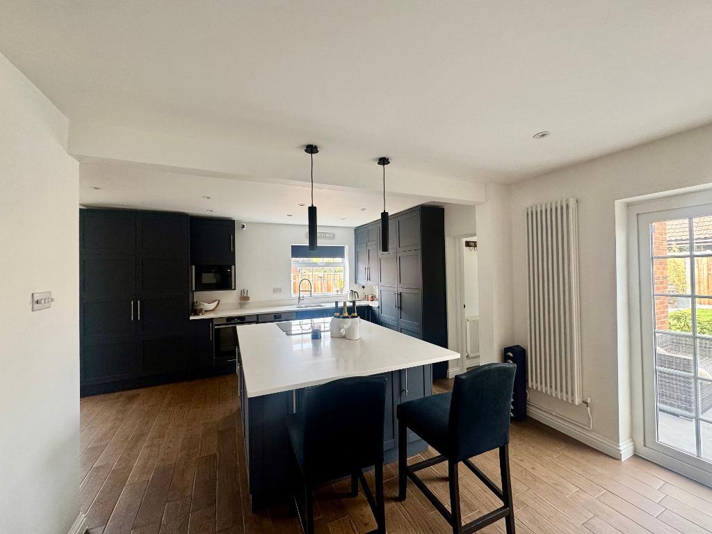 The accommodation comprises of a foyer / play area leading to a study area, lounge which could easily be used as bedroom 4. The stunning open plan kitchen / dining area with its feature island all worktops are granite, with designer cupboards, high end appliances and a Franke designer sink. To the rear of the house there is a utility area and guest cloakroom/WC.