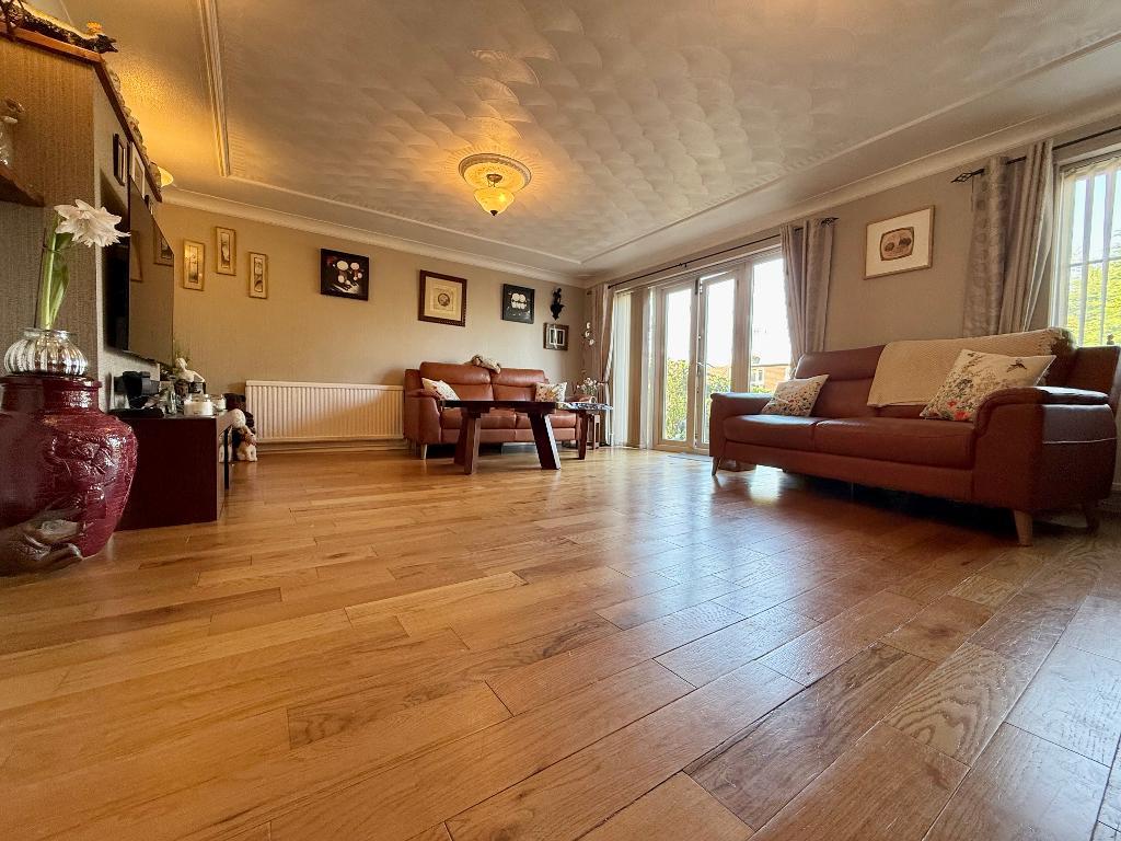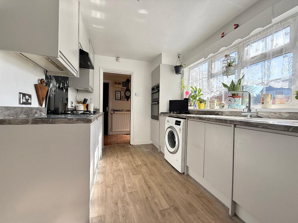 The property briefly comprises a spacious entrance hall with tiled flooring, leading into a bright and versatile living/dining room with French doors opening onto the rear garden. The kitchen is fitted with a range of modern handleless wall and base units, an inset sink, built-in oven, hob and extractor, along with an integrated fridge and bin. There is also space for a washing machine and direct access to the garden. A ground floor shower room includes a walk-in shower, wash hand basin and WC.
